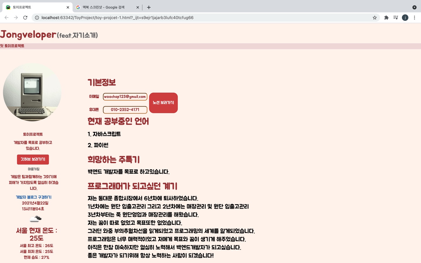 맨 위의 부분에서는 h1태그를 이용해 나의 개발자 별명인 Jongveloper를 넣었고